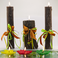 Коллекция свадебных свечей "Осенняя сказка", выдержана в естественном природном стиле. Настоящим украшением коллекции служат разноцветные плавающие свечи в виде кленовых листочков. Эта коллекция свадебных свечей будет как нельзя кстати, если вы задумали нечто особенное, не похожее на традиционную свадьбу, украшенную длинными античными свечами в высоких стеклянных подсвечниках. Природный стиль наших свадебных свечей обязательно разбудит вашу фантазию, и в праздничном интерьере появятся срезанные в саду зеленые ветки, а на голове невесты, вместо искусственных цветов, венок из кленовых листьев. Церемония зажжения "Семейного очага" с такими свечами может стать самым ярким и незабываемым моментом всего торжества.
